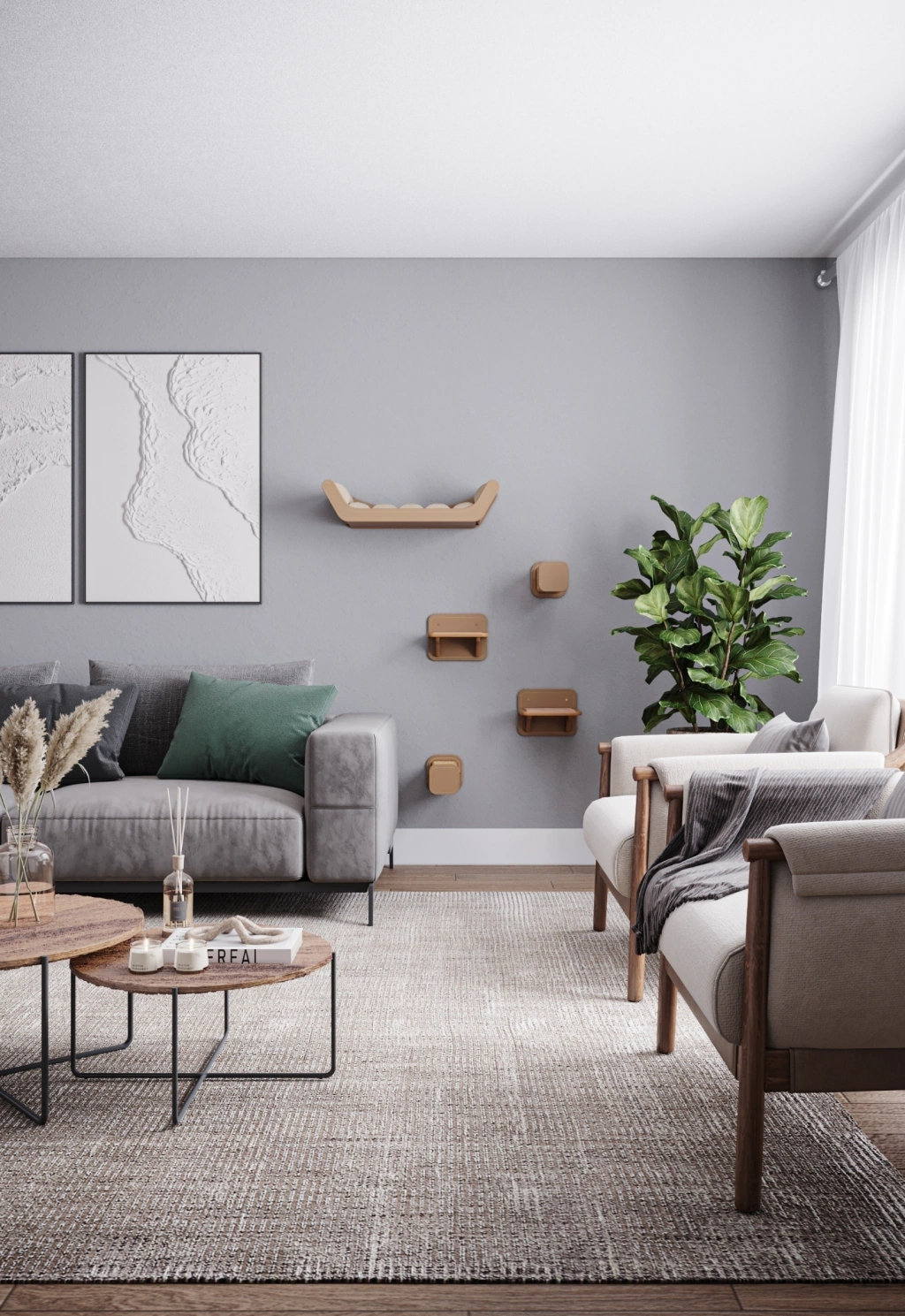 O Playground Merlot é composto por 1 Cama Raj, 2 Prateleiras Lion M e 2 Arranhadores Scar.